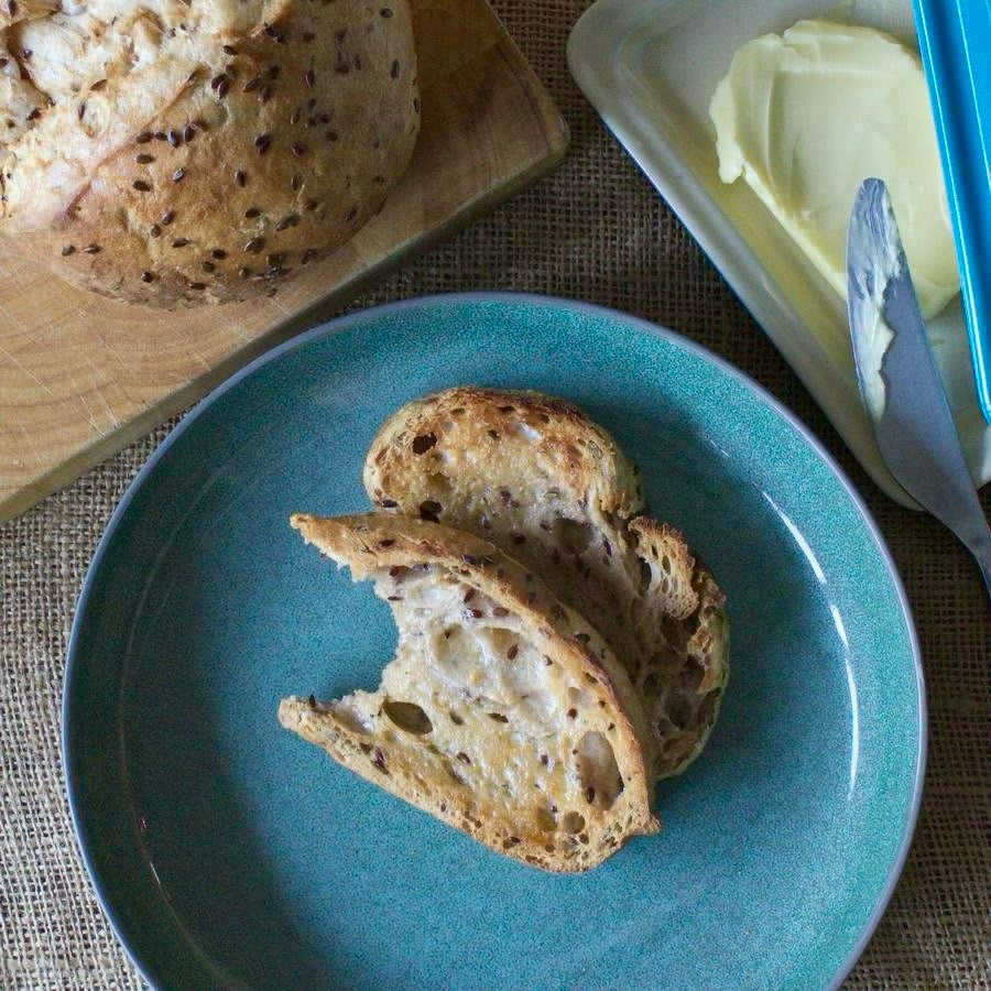 Made with a teff-based gluten-free sourdough starter, this loaf has a naturally rich, dark crumb and a soft, satisfying texture. Flaxseed adds a subtle nutty flavour and gentle crunch, enhancing its wholesome character. Baked fresh to order, it’s a versatile loaf that pairs beautifully with both sweet and savoury toppings.